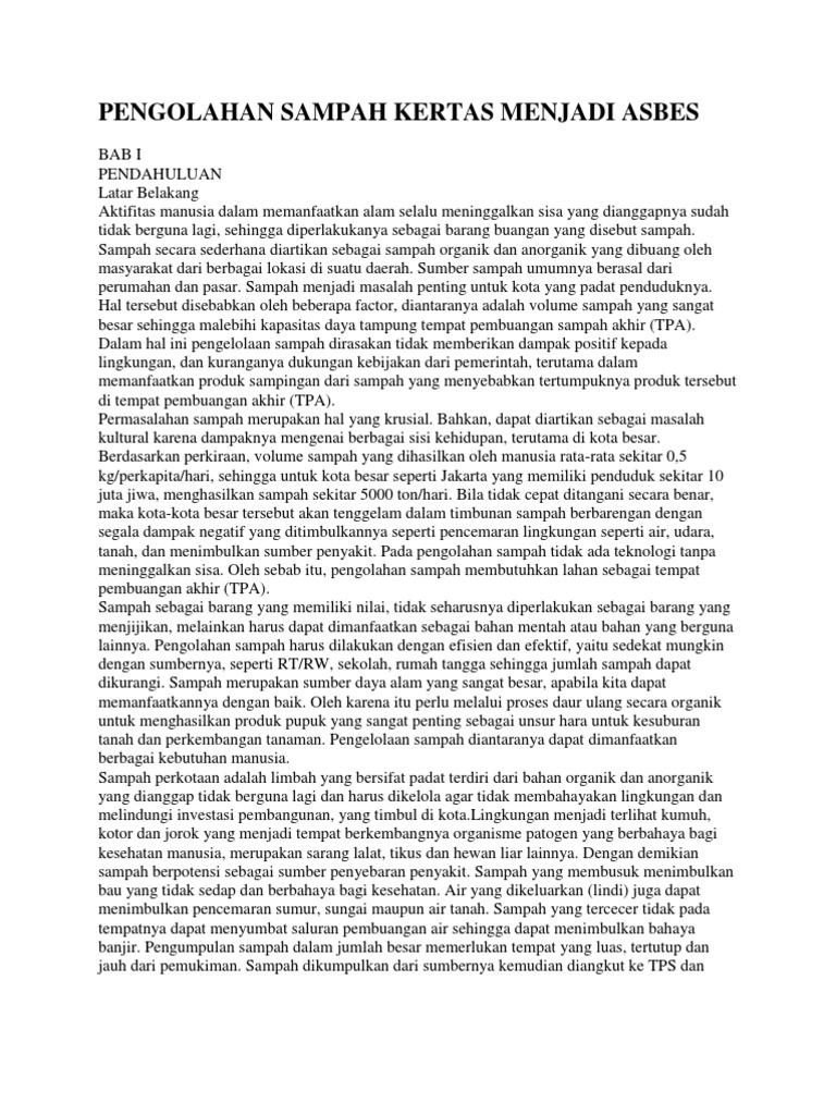 Raihan.f.sihombing natalia nina.k.g silvia melinda dina feby smp negeri 10 medan 2014 solusi sampah pada kehidupan sekitar kata pengantar segala puji syukur kami panjatkan ke hadirat tuhan yang maha esa atas berkatnya yang sangat melimpah sehingga makalah ini dapat kami selesaikan.makalah yang kami beri judul "solusi sampah pada kehidupan sekitar. Mar 29, 2017 · penelitian karya tulis ilmiah "pemanfaatan sampah anorganik untuk kerajinan tas di sma negeri 2 malang" bertujuan untuk menginformasikan pada pembaca betapa pentingnya manfaat penanggulangan sampah, daur ulang sampah anorganik untuk kerajinan tas supaya sampah bernilai ekonomis tinggi dan sampah tidak menumpuk dan tidak merugikan diri sendiri dan orang lain. Rio siswantoro 13211062 muhammad rizal mantofani 13211060 sekolah tinggi teknik dharma iswara madiun madiun 2014 2. Jul 29, 2015 · karya tulis ilmiah yang berjudul "pemanfaatan sampah sebagai pupuk kompos" telah disetujui untuk disahkan. I pemanfaatan sampah plastik sebagai pendukung perkembangan industri kreatif nasional diusulkan oleh :